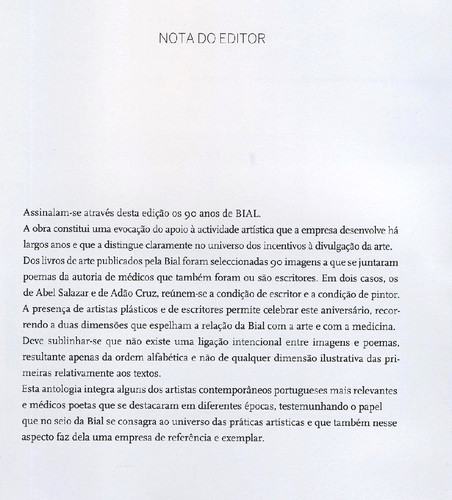 "Magnífica obra comemorando os noventa anos da BIAL, com prefácios de João Lobo Antunes e Manuel Sobrinho Simões. Noventa Pinturas de autores com obras publicadas pela BIAL e Noventa Poemas de autores médicos, antigos e contemporâneos"